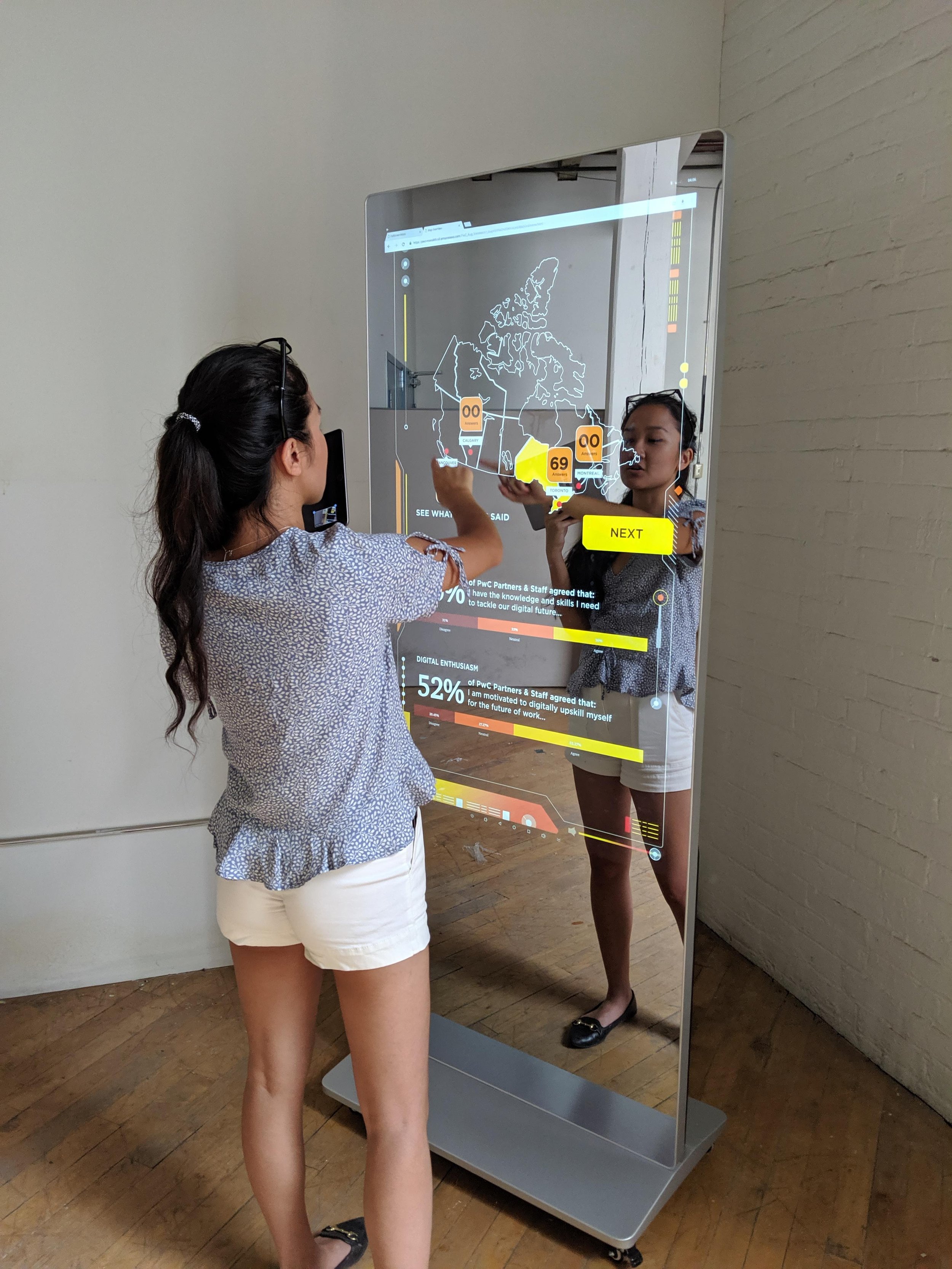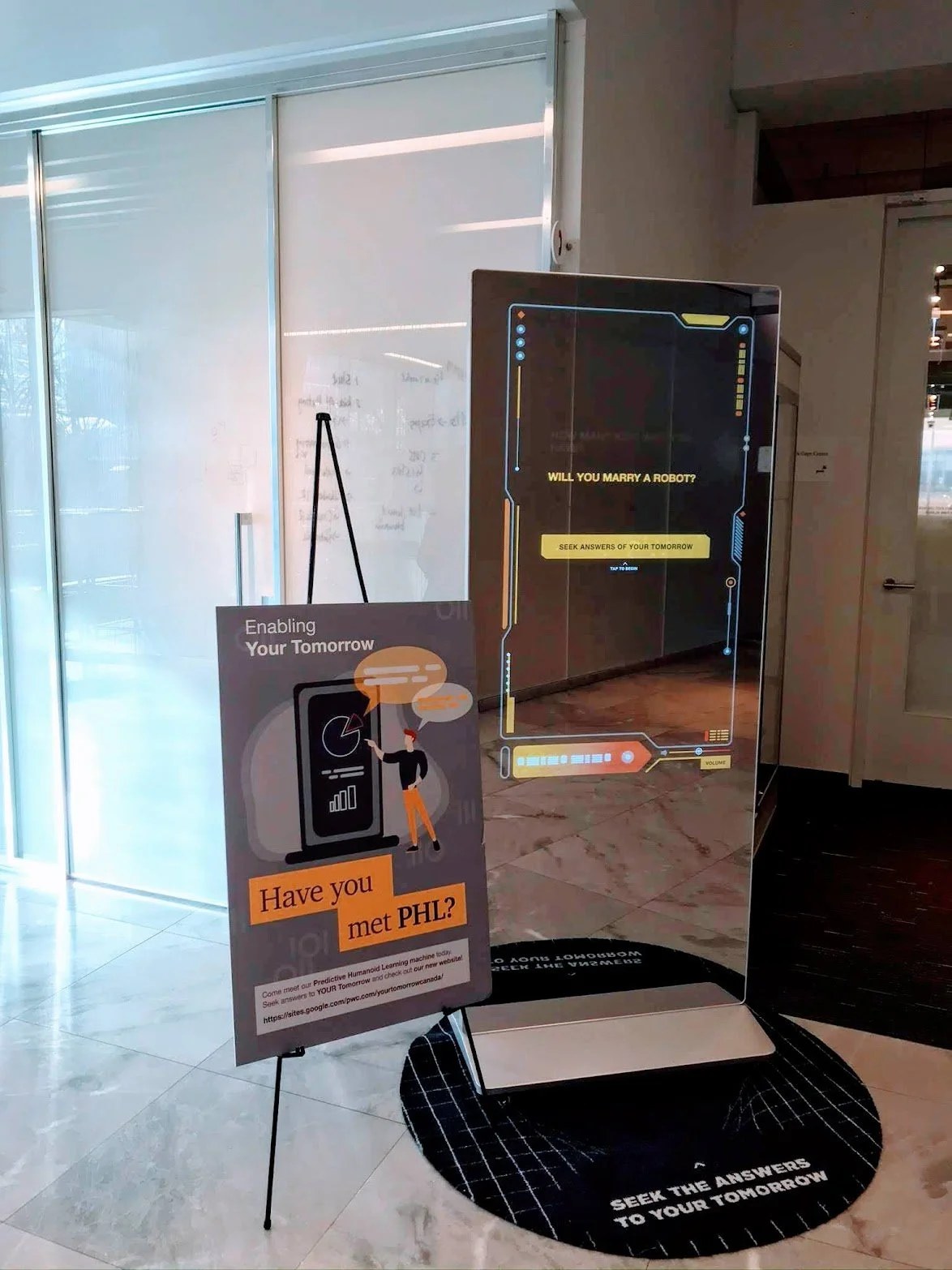 As individuals passed by the monoliths, PHL, the interactive 'AI' bot, engaged with them, initiating conversations and enticing them to explore further. This strategy was designed to evoke a sense of curiosity and create an immersive experience, with the ultimate goal of encouraging active participation and feedback from PwC employees and partners.